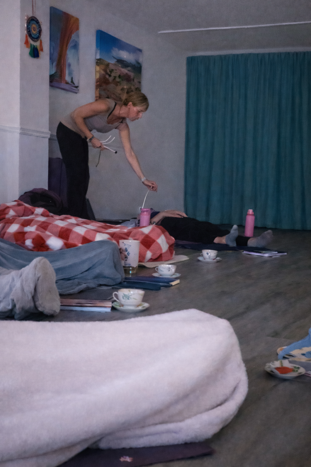 Participants are asked to bring personal comfort items such as mats, blankets, pillows, and eye masks. Jen provides music, incense, cards, tea, and other supportive elements to help create a warm, grounded atmosphere.